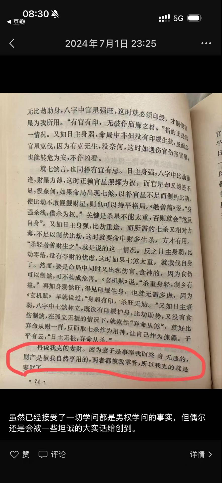 那么,到底什么是女本位八字?渡渡是一名产品经理,对八字研究颇深,负责团队中的底层逻辑架构。她解释说,在著作如《中国古代算命术》里,女人是男人的附属。但是随着时代变化,“夫星被克”可能不再意味着你要结好几次婚,而是“粉了三个爱豆,前两个塌房了,第三个还不错”。渡渡觉得,玄学本质上是科学,不管东玄还是西玄,算出来结果都没太大偏差,殊途同归,“那完全可以把女性作为主体,拉到和男性平等的立场去看八字。”
