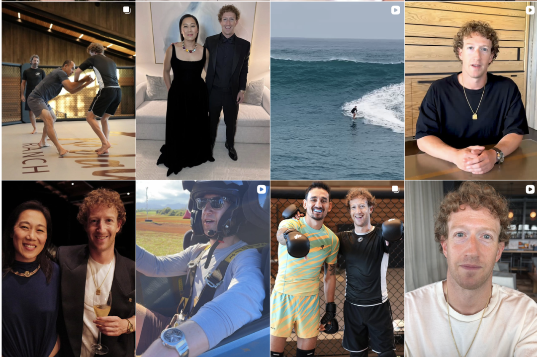 现在的扎克伯格,仿佛换了一个人。他留起了卷发,脖子上挂着金链子,在Instagram近一半的内容都是格斗训练、被汗水浸透的肌肉、WWE现场的VIP观战席。