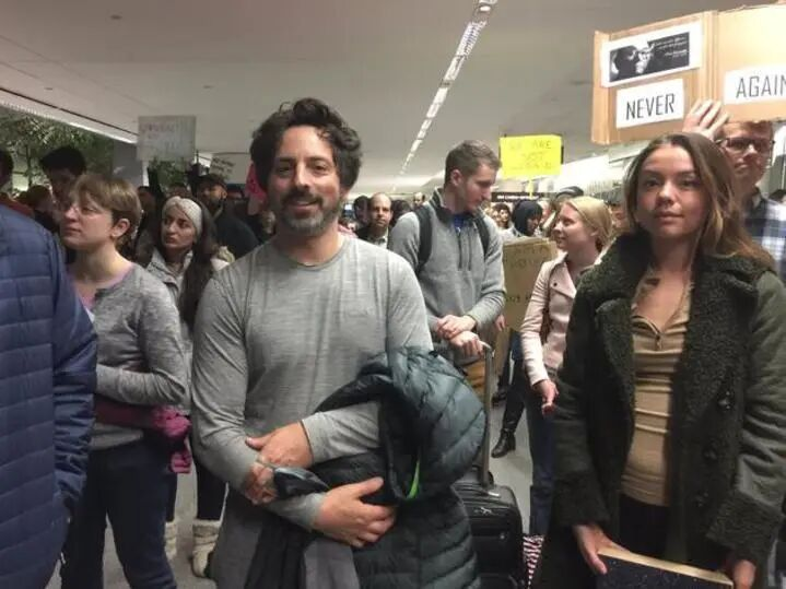 2017年,身为前苏联难民,同时也是谷歌联合创始人的谢尔盖·布林曾冲到旧金山机场抗议特朗普的移民禁令,他和数千位抗议者站在一起,表示自己就是难民。