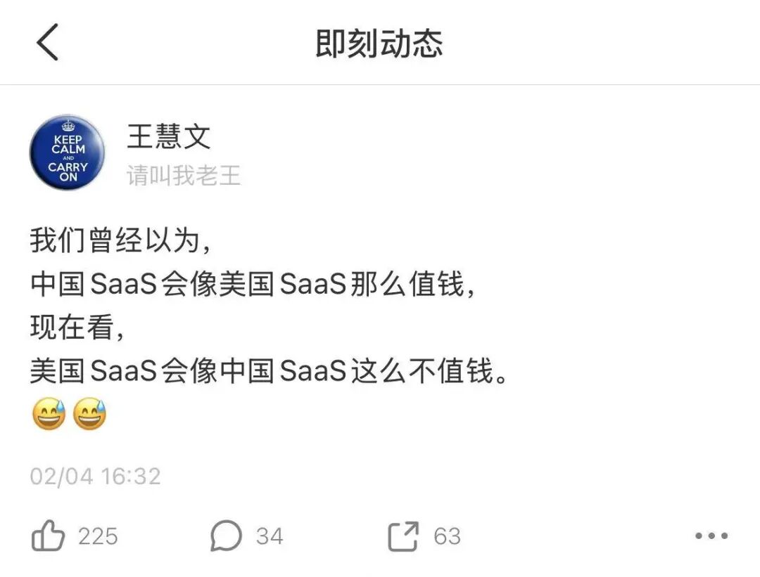 “我们曾经以为,中国SaaS会像美国SaaS那么值钱,现在看,美国SaaS会像中国SaaS这么不值钱。”