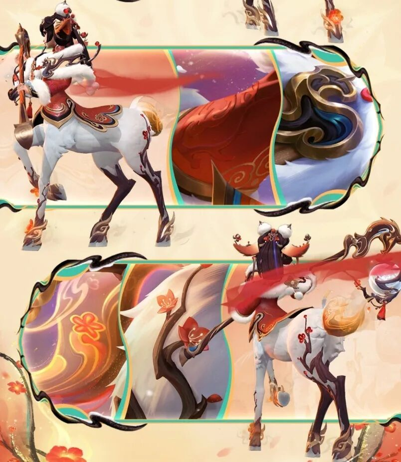 在今年的马年限定皮肤里,这种“吉祥BUFF”被具象化为峡谷里的祥瑞之兆,像莉莉娅、人马和小火龙等英雄,直接融入了天马、獬豸和貔貅的兽形,也被赋予了对应的福乐盈门和聚珍纳宝的祝福;