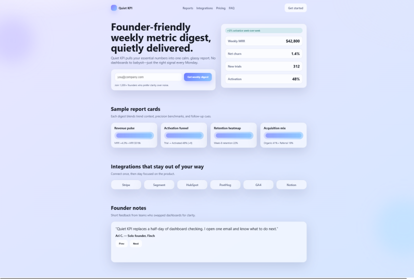 它还做了一个自动切换的用户评价轮播,包含三条不同的用户评价,而不是只有一条,让整个页面感觉更完整、更接近可以上线的状态。