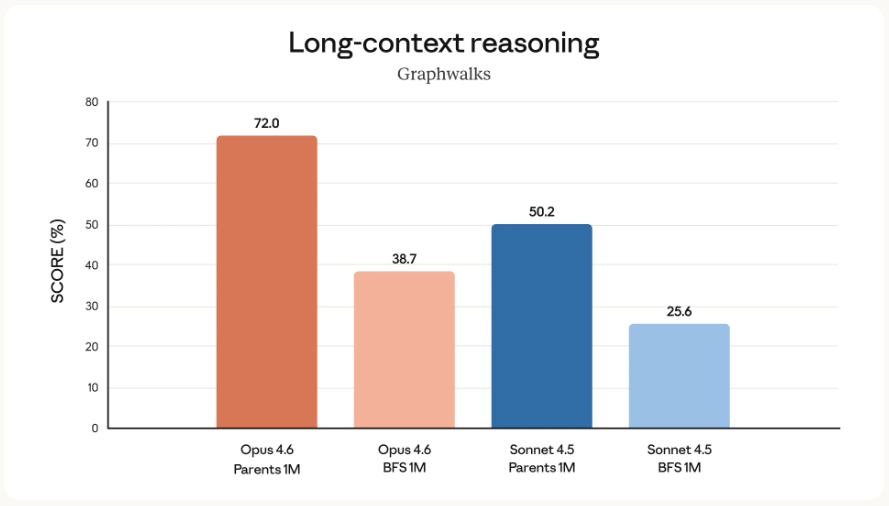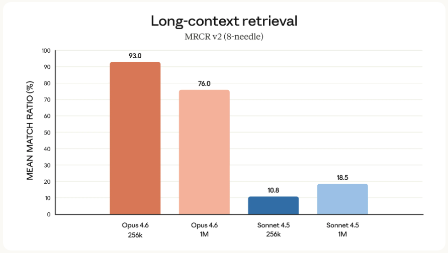 在100万token、藏8根针的测试里,Opus 4.6直接拿了76%,而Sonnet 4.5只有18.5%,太牛逼了!