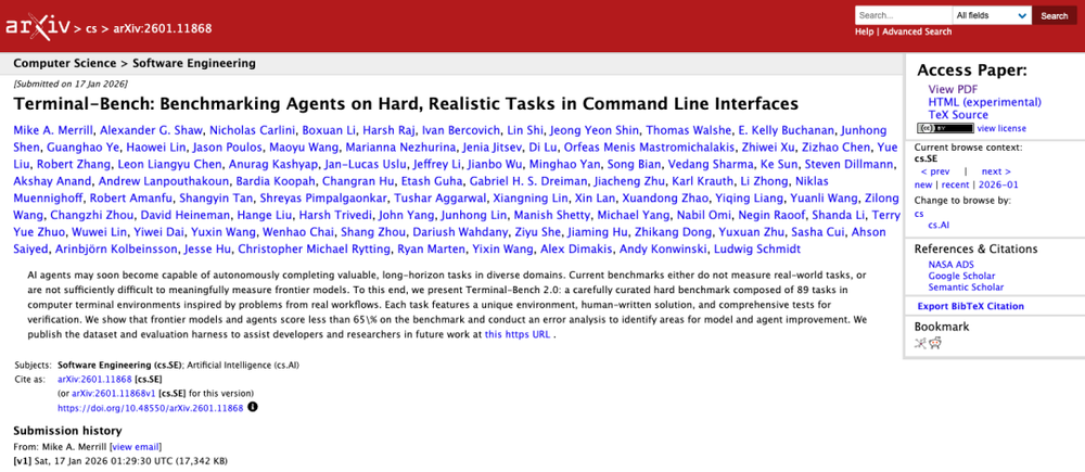 唯一一个对齐的基准是Terminal-Bench 2.0,这是一个由89个复杂真实任务组成的基准,这些任务都在终端环境中执行,每个任务运行在独立Docker容器内。