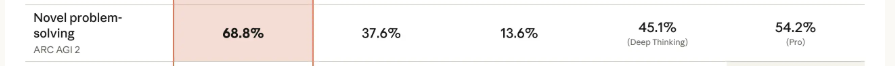 然后最离谱的是这个,ARC AGI 2,68.8%,吊打一切。。。