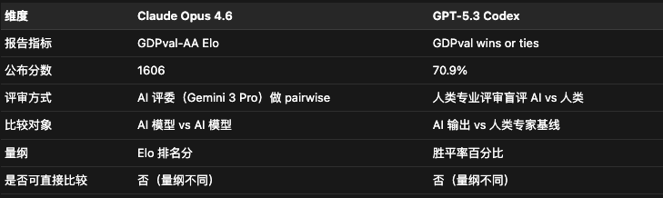 GPT-5.3 Codex的“GDPval wins or ties:70.9%”,使用的是OpenAI自己的方法,由职业人类评审盲评AI产出与人类专家产出,判断AI版本是否“与人类一样好或更好”,分母是固定的人类标准。