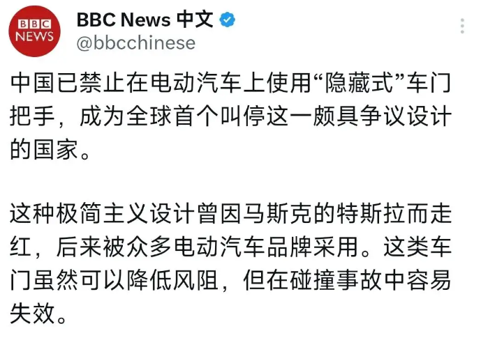 至此,中国成了全世界第一个用立法形式,限制全隐蔽式车门把手的国家。而且引来了彭博社、英国BBC、《卫报》等外国媒体纷纷叫好跟。BBC表示:“中国在全球汽车产业的巨大市场体量与产业影响力,意味着这一举措或将产生全球性影响”。
