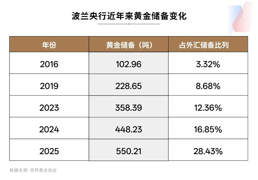 2025年,波兰国家银行(NBP,以下简称波兰央行)以约100吨购金量,连续第二年成为全球最大黄金央行买家,且黄金储备已达550吨,超过英国。