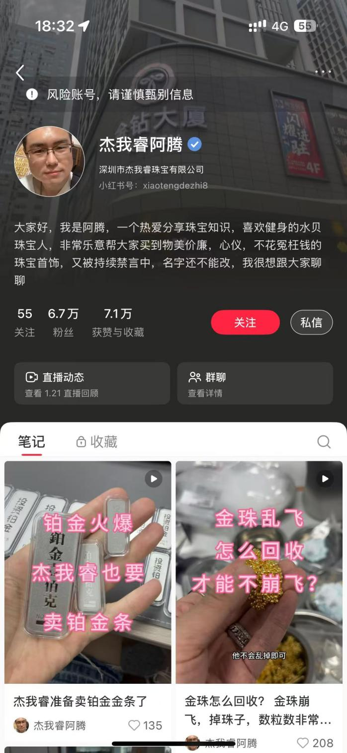 这场“黄金坑”的主角——深圳市杰我睿珠宝有限公司,成立于2014年。企查查显示,张志腾于2024年7月首次持股并成为实际控制人,注册资本为1100万元,但公司参保人员仅为15人。记者翻阅其小红书账号“杰我睿阿腾”发现,其最早发帖于2021年12月,早期以买卖钻戒及黄金为主,向消费者展示寄卖日常情况,以及科普加工、回收等工序。