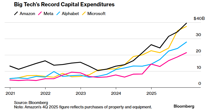 而亚马逊周四更是宣布2026年资本支出将达到2000亿美元,其股价在盘后交易中应声下跌。