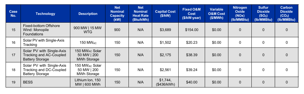 上述图表列出了每种发电技术(煤、气、风、光、核、储能)的关键经济与物理参数。