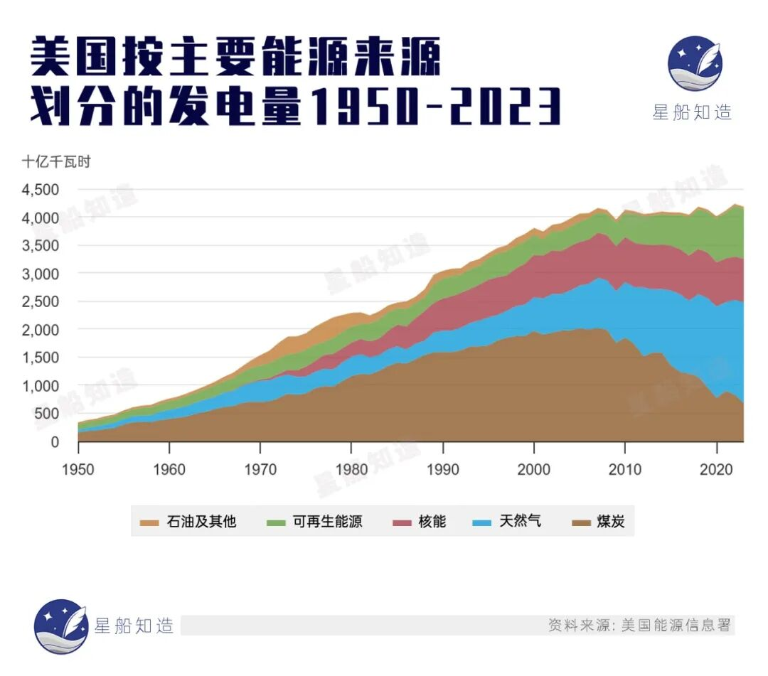 《星船知造》综合美国能源信息署(EIA)等统计——美国燃煤电厂的数量自2005年开始大幅下降。2005年,美国燃煤电厂供能占比达到50%,但到2025年时已不足17%。取而代之的是天然气发电额升至43%以上。