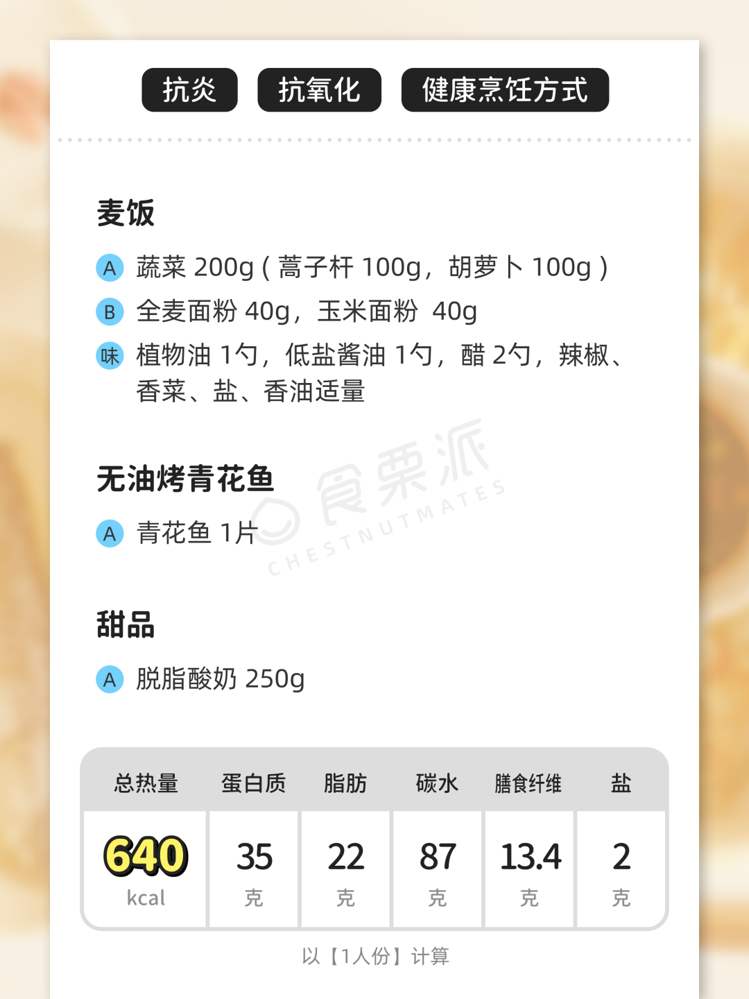 【说明】食谱的能量通常在1500~1700kcal/天左右,适合一般轻体力活动女性。男性以及身材更高大、活动量高的人觉得吃不饱,可适当增加主食和肉菜;或者找营养师(详询小栗子:chestnut_shanzha)帮你定制食谱。