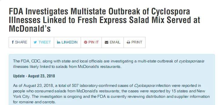 ▲2018年美国就爆发一起麦当劳沙拉有关的食物中毒事件,原因是沙拉的寄生虫。