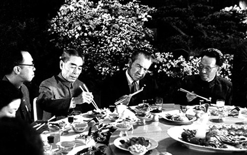 1972年尼克松访华时与周恩来在国宴上进餐(资料片)