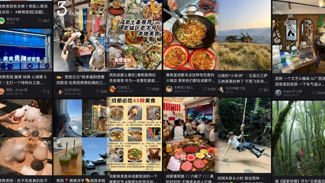 近几年,往西南旅游、旅居的人越来越多了,“爽爽的贵阳”“秘境云南”“安逸成都”的标签在手机里叠成另一张地图。巨量算数的数据显示,截至2025年8月,抖音平台“云南旅游”“贵州旅游”话题的视频播放量分别达到134.6亿次、92.4亿次。