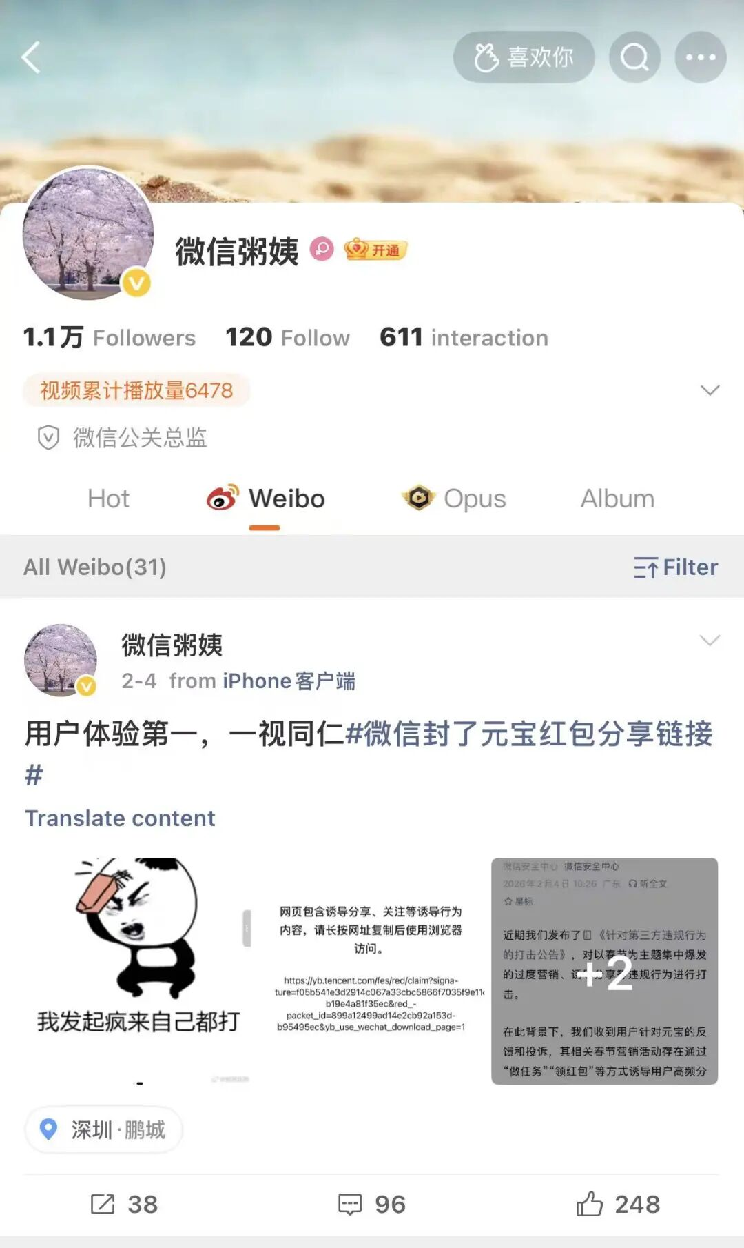 2月4日,在元宝红包可以提现的当天,微博认证为微信公关总监的博主“微信粥姨”发文,配了一张“我发起疯来自己都打”的图片,并说“用户体验第一,我们一视同仁”。与此同时,很多网友发现,元宝的红包链接被微信禁了。
