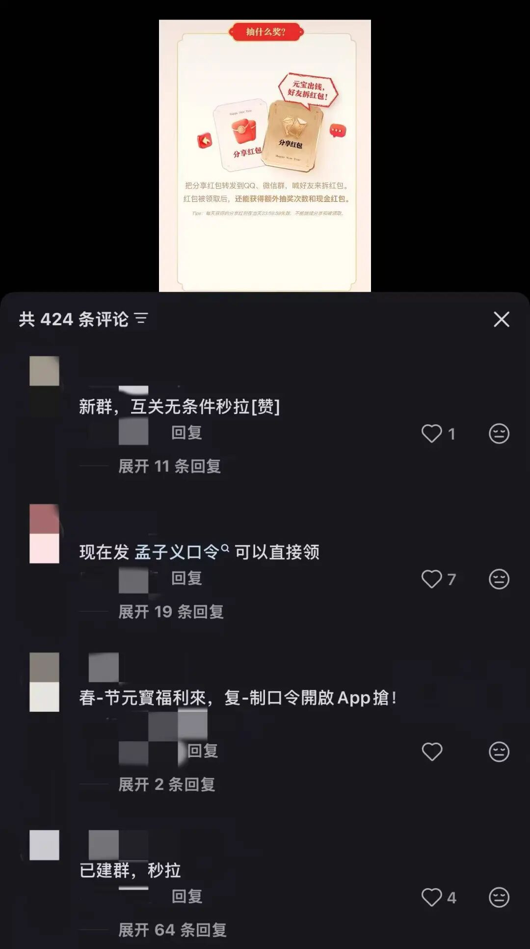 在元宝活动的前三天,微信、QQ群中充斥着元宝红包的分享链接,在各大社交平台,只要是主题和元宝相关的帖子,评论区里全是复制口令、拉人进群互助的用户,各种元宝互助群遍地开花。这种裂变式拉新,让元宝的下载量超过了豆包,迎来了流量巅峰。