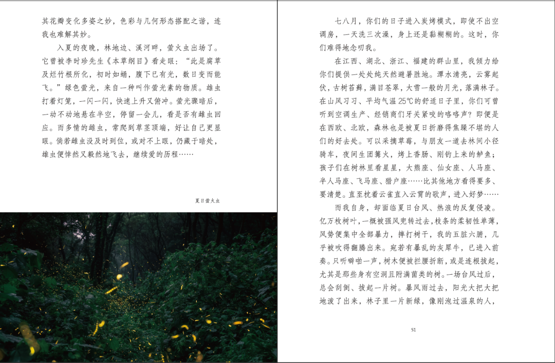 最典型的就是《少年森林纪》中的拟人化叙事。让有着上亿年历史的森林开口说话,与小读者亲切交流,平静叙述着它的发展历程和经历的雨雪风霜。这种方式既保留了知识的专业性,又增添了阅读的趣味性。
