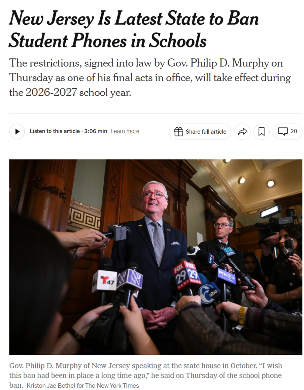 就在今年1月8日,新泽西州正式签署法案,成为美国最新一个「禁止手机入校」的州。州长Murphy在签字时感慨: