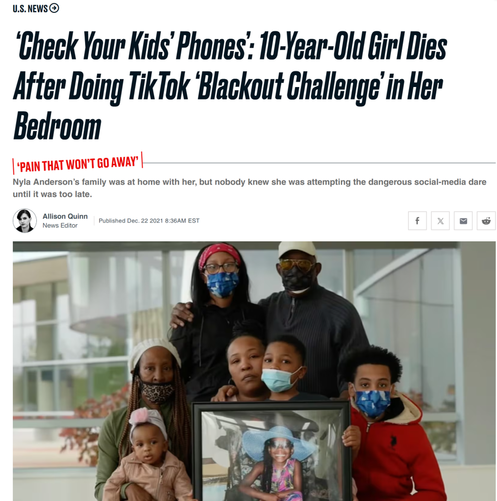 最令人心碎的案例发生在宾夕法尼亚州。一位名为Nyla Anderson的10岁女孩,独自在卧室刷视频时看到了这个挑战。
