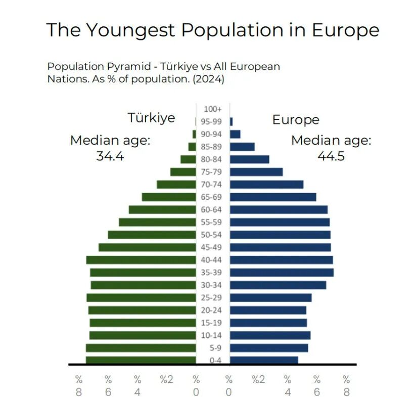 截至2025年底,土耳其人口约为8570万,相较于人口规模本身,对早期投资更具吸引力的是其显著年轻化的年龄结构。土耳其人口中位年龄为34.4岁,比欧洲平均水平年轻约10岁。这一差异,直接影响着劳动力市场的活跃程度、技术采纳速度以及风险的社会承受力。