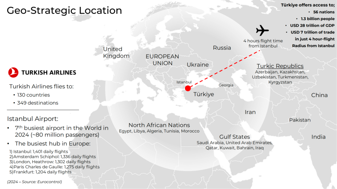 在投资分析中,横跨欧亚大陆的土耳其常被描述为地缘枢纽。2024年,伊斯坦布尔机场已成为欧洲最繁忙的航空枢纽。土耳其航空公司网络覆盖130个国家、349个目的地。以伊斯坦布尔为中心,4小时飞行半径内可覆盖56个国家,涉及约13亿人口、28万亿美元GDP以及7万亿美元贸易规模。这一“4小时航程”圈同时覆盖欧盟、中东、北非、中亚及部分南亚市场,在实际操作层面显著降低了跨区域市场验证、资本对接与运营管理的成本,为创投机构进行多区域布局提供了现实便利。