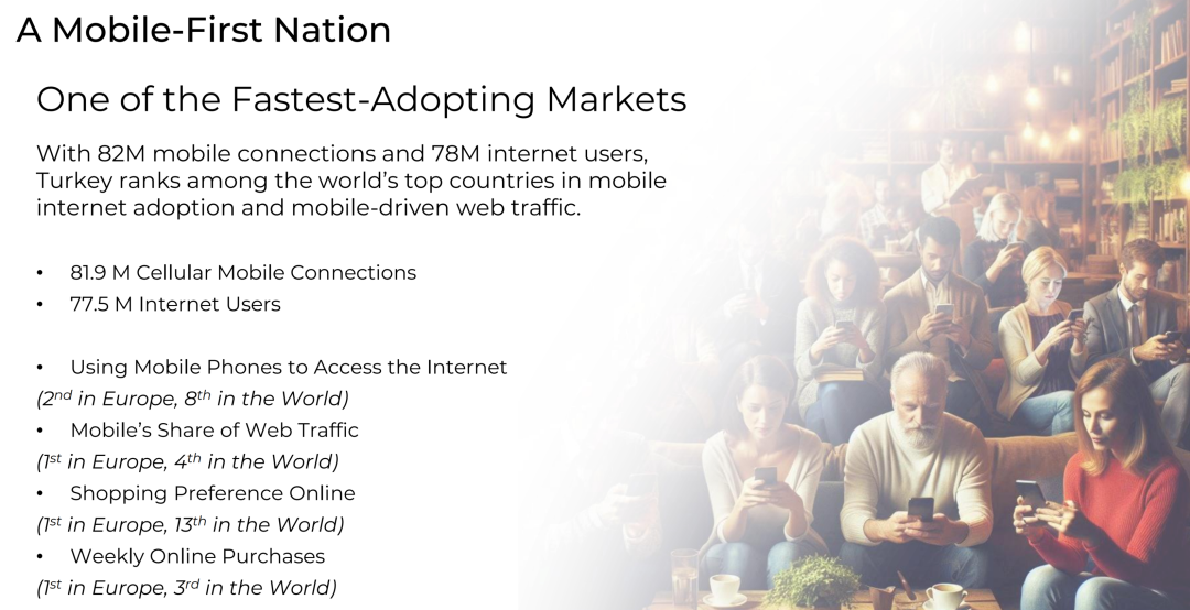 当前,土耳其已具备高度成型的数字社会基础。数据显示,土耳其目前拥有约8190万的移动网络连接和7750万的互联网用户。在欧洲范围内,其通过移动设备接入互联网的比例位居前列,移动端在整体网页访问中的占比排名第一;在在线购物偏好和网购频率等指标上,同样处于欧洲领先水平。