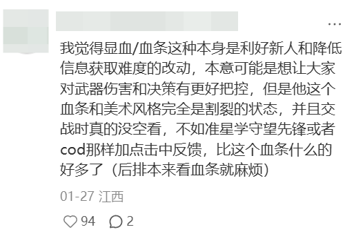 单论玩家体验上,对于老玩家来说,血条的加入要么会让战斗对枪的过程被简化、失去了过程中预判和博弈所带来的妙不可言的乐趣;要么会让对局需要处理的信息变得混乱。同时,也让此前苦练索敌的他们,有一种努力付之一炬的感觉。