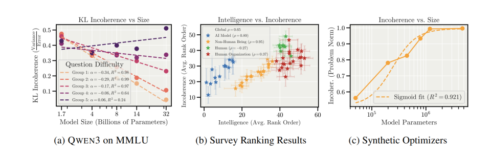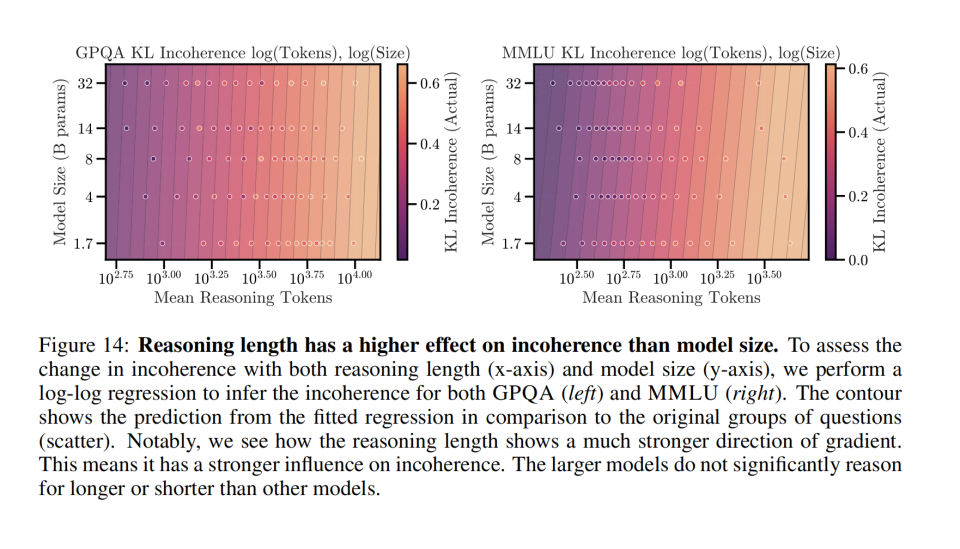 第二个结论是模型越大,在难题上越不连贯。这是最反直觉的一点。我们通常认为大模型更稳定。但在最困难的任务上,实验数据表明,虽然规模更大的模型总错误率降低了,但它的不连贯性反而上升了。