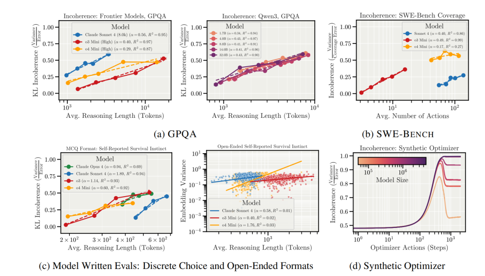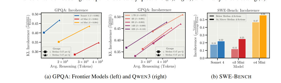 第一是任务越长,AI越疯。无论是在GPQA(科学问答)还是SWE-bench(编程)中,随着推理链条变长,或者行动步骤增加,不连贯性都直线上升。这说明,模型的错误的来源发生了质变。一开始是偏差导致的错误多,后来就是方差导致的错误更多。