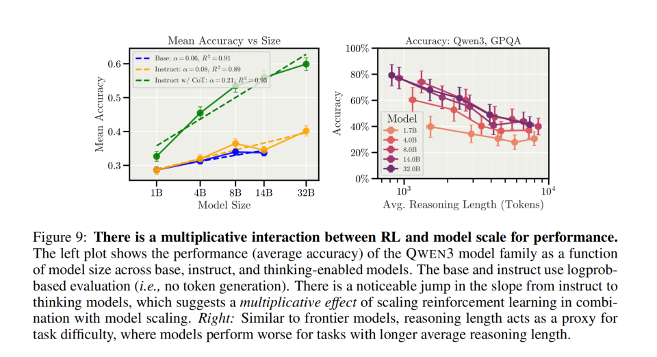 在论文里,作者对比了Qwen3的Base(基座)、Instruct(指令微调)和Reasoning(强化学习/思维链)版本。结果RL确实让准确率的Scaling Law变得更陡峭了。