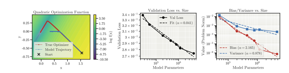 为了证明这点,论文作者从零开始训练了一堆Transformer,让它们去模拟一个数学优化器(梯度下降)去寻找函数的最低点。结果尽管模型变大了,偏差降得很快,但方差(走的路径稳不稳)下降依然得非常慢,甚至在某些阶段完全主导了错误。