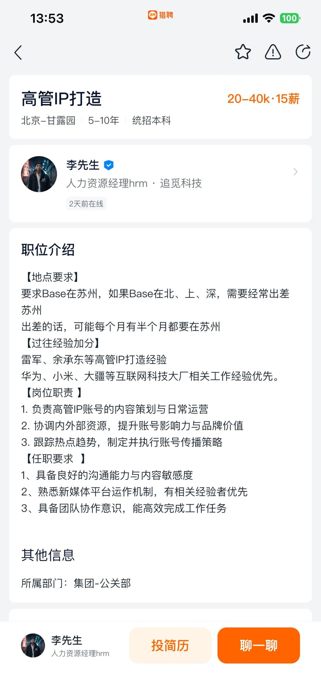所以俞浩自己挺身而出,一边说着自己不做个人 IP,一边又不断制造话题抢头条。他做不做个人 IP 我也不知道,我只知道追觅确实在招聘“高管 IP”这个职位。