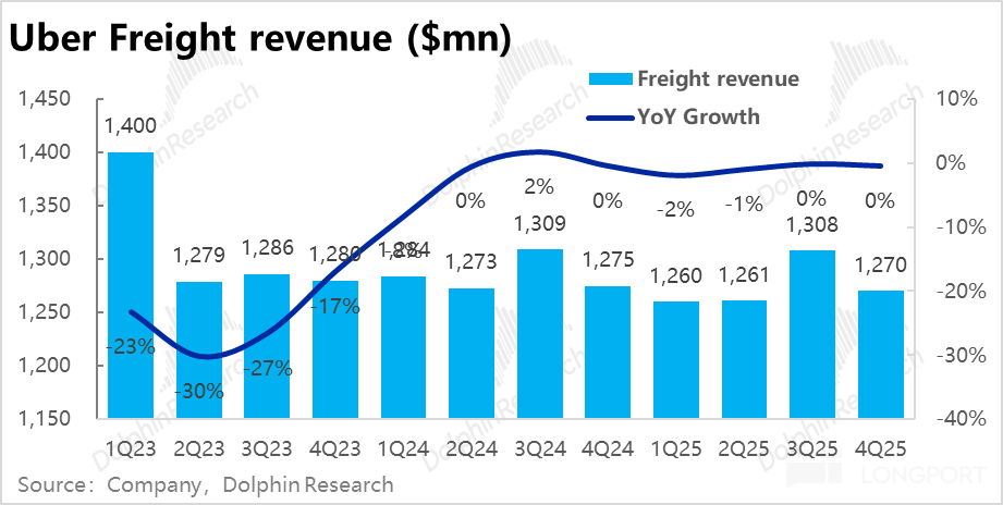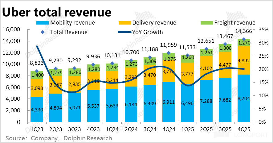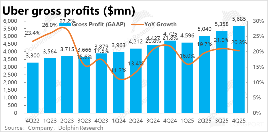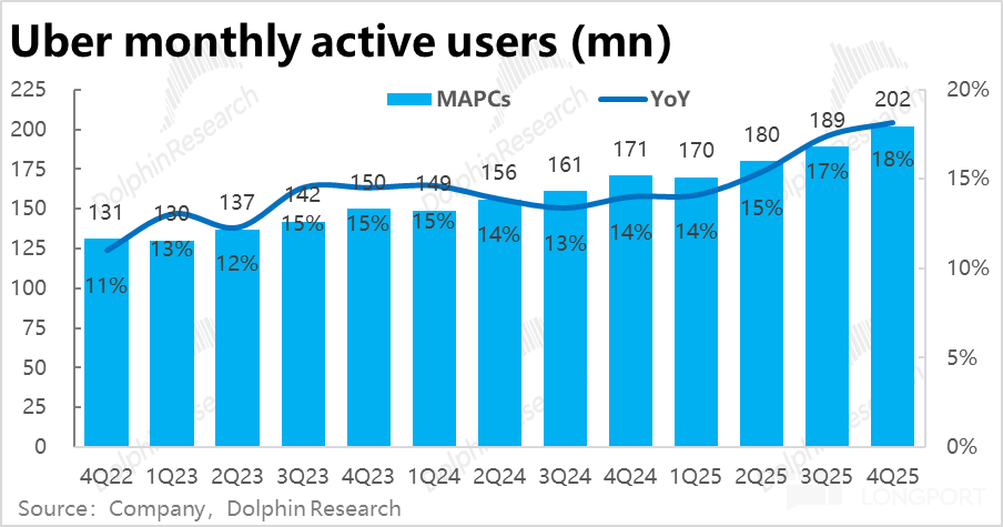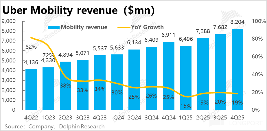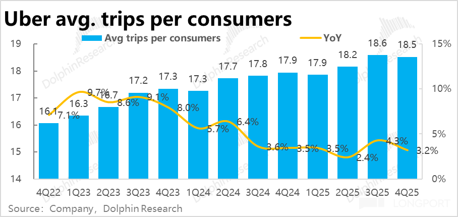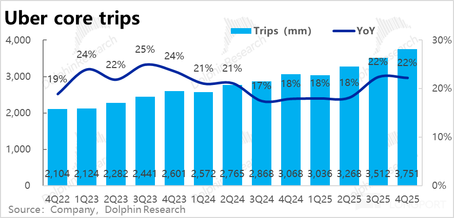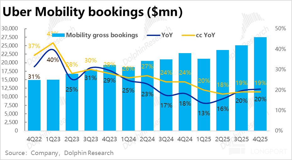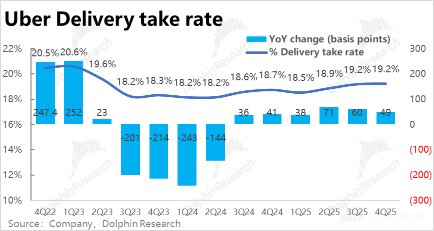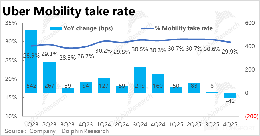 相比之下,Uber eats 外卖业务表现更加强劲,本季订单金额增长进一步加速到 26.4%,即便剔除汇率利好,同样环比提速 2pct。25 年内增速(不变汇率)由 18% 持续拉升到 26%。