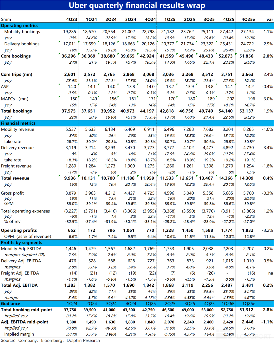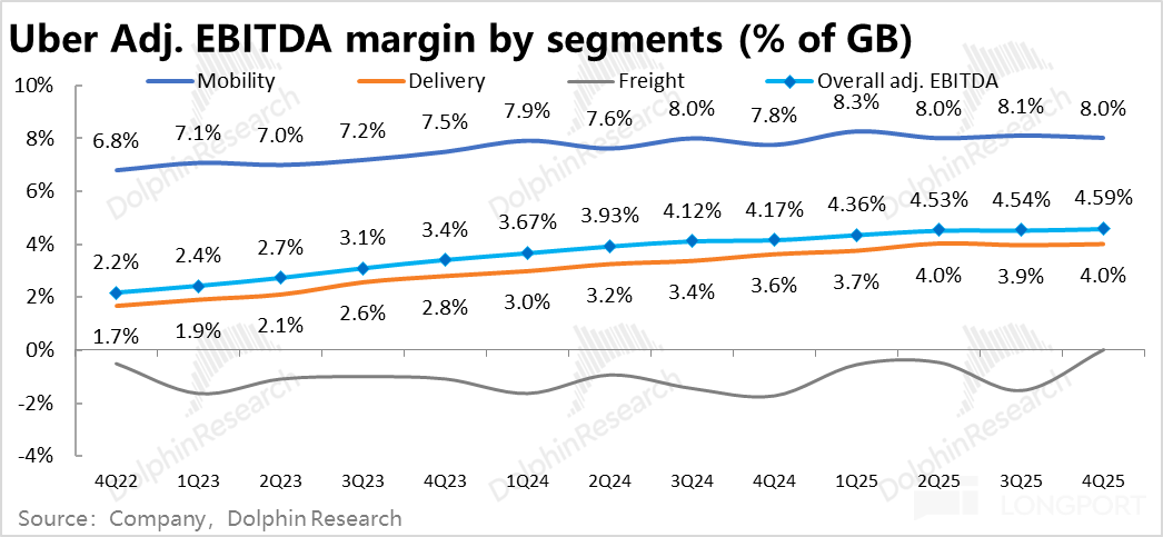由上文可见,Uber 本季在高速增长的新增用户带动下,增长端表现不错。但对应的,为了拉动用户增长,Uber 本季各项业务的利润率相比预期略有跑输,但利润额表现不差。