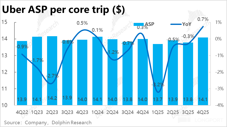 分价量驱动因素看,Uber 的核心订单额顶着不算太好的宏观消费环境、加速增长,仍主要是靠更健康的量的增长。本季核心业务订单量同比增长 22.3%,环比持平在高位。同时,平均客单价也同比扭跌转涨了 0.7%。