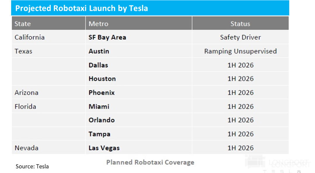其中Tesla 期望在 26 年底覆盖美国 1/4~1/2 的地区(主要取决于政府准入的进度),目标进入数十个主要城市,并预计车队规模将以 “每月翻倍” 的速度快速扩张。