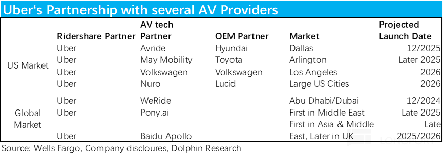 根据梳理,仅25 年至今 Uber 就与合计 7 家自动驾驶技术方,还有汽车制造商达成合作协议,在美国和全球内多个城市内协力提供无人网约车服务。