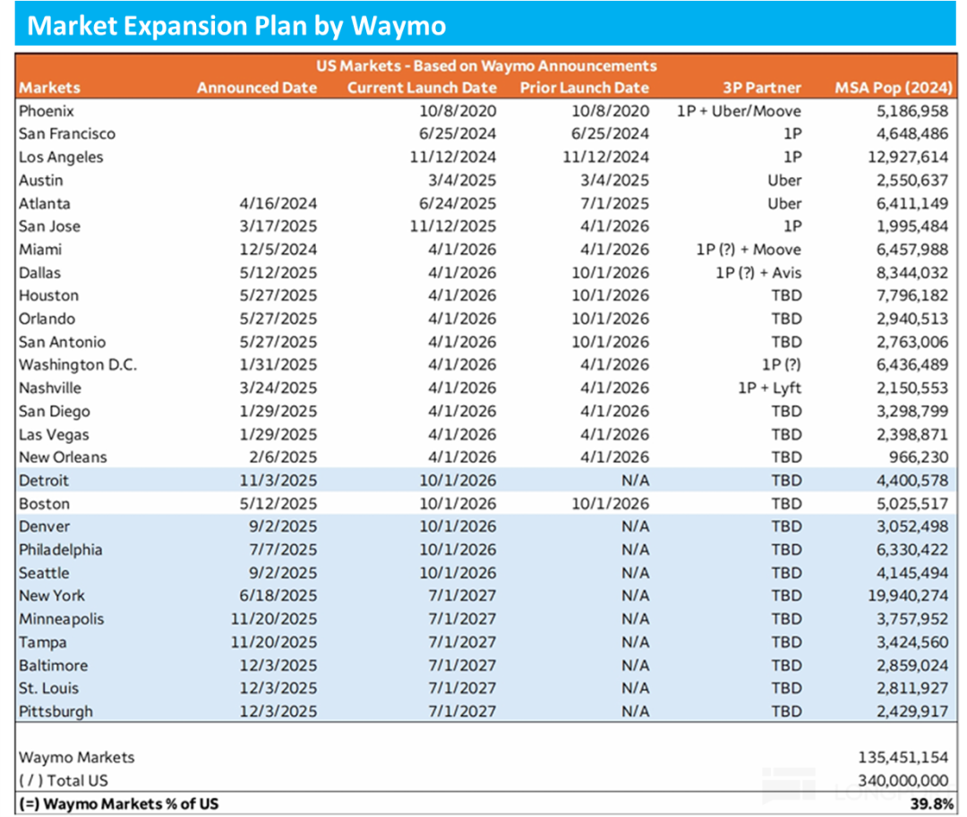 类似的,根据 Waymo 目前的拓展计划,到 2027 年中 Waymo 的无人驾驶网约车服务将覆盖全美 40% 的人口。