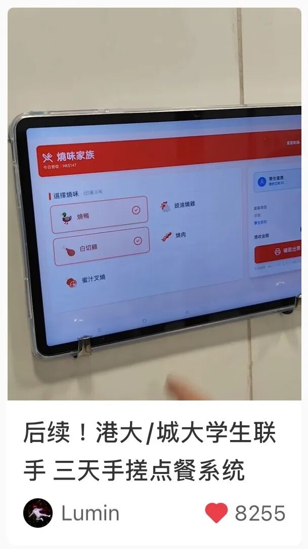 如果你现在在小红书上搜索“港大烧味家族”,第一页的结果就可以看到一篇叫做「港大/城大学生手搓点餐系统后续」的帖子,发帖人叫做Lumin,是一位来自香港大学电子电气工程的研一学生,也就是整个行动的发起人。Lumin在附近读书,是烧味家族的常客,也亲身经历了小红书的走红事件。一次买饭排队的时候,Lumin听到前面的同学在和老板聊天,内容大概是说老板在为繁忙时间的点餐效率而苦脑,而商用点餐机的话最少都要三四千左右,甚至还有上万的;前面的同学也是一个热心肠,他就说要不找找会编程的同学来看看?一开始Lumin只是想八卦一下的,结果听到的却是老板的困扰和需求,还看到了老板一脸愁容的样子,他自己也下意识地在脑子里帮忙想办法,突然想起了本科的时候自己就参加过电子设计大赛,有过设计类似产品的经验,所以当机立断就决定帮定老板这个忙了。