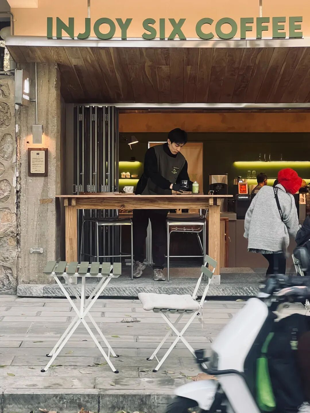 再把镜头拉近,聚焦敬德巷这家店。100来个平方,装修花了不少心思:粗犷工业风搭配木纹,暖黄色射灯一打,牛油果绿配色的VI标识格外跳脱。落地窗全部打开,坐满外摆的顾客就是这家店最好的广告。