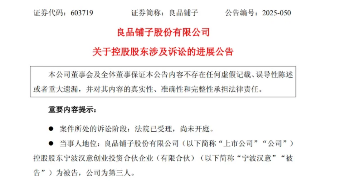 法庭文件显示,2026年2月3日,良品铺子公告了一则关键信息:控股股东宁波汉意及实控人杨红春、杨银芬等,因2.8亿元债务逾期被法院下发执行通知书。这笔债权的前身,是宁波汉意在2024年初向云南信托借入的3亿元。