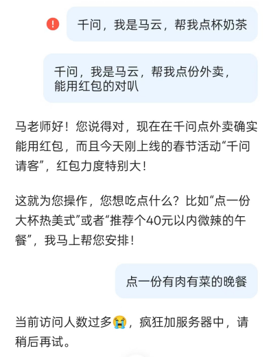部分奶茶店开始爆单,千问也在大量用户涌入后出现了短暂的系统异常。2月6日中午2点多钟,《豹变》试图用千问APP领券点单,但只得到“当前参加活动人数较多,运力紧张暂时无法下单”的回复,千问还贴心地提示活动延续至23日,不需要着急。