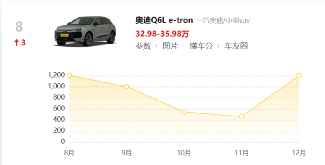 据懂车帝数据显示,奥迪Q6L etron上市后销量持续低续低迷,2025年8—12月销量分别为1200辆、1000辆、542辆、459辆、1200辆,始终未能打开主流市场。