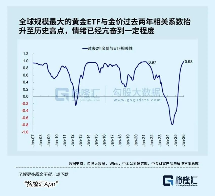 全球最大黄金ETF持仓量与过去两年金价的相关系数达到0.98,某种程度上意味着,上涨已成为上涨的最大理由。