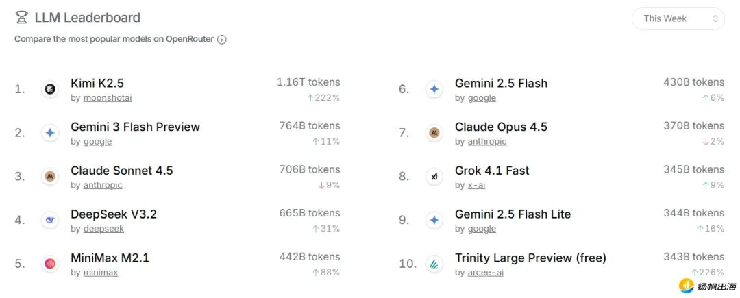 OpenRouter一周总榜。图源:OpenRouter