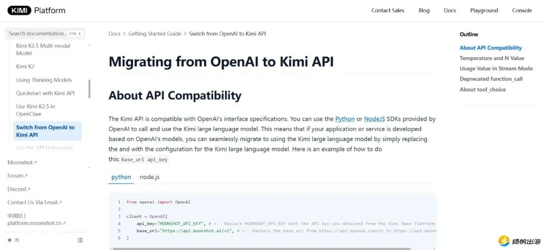 Kimi API兼容OpenAI的接口规范。图源:Kimi Platform
