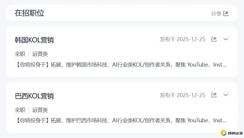 到了12月,月之暗面的招聘重心更加清晰:新增韩国、巴西两个市场的KOL营销专属岗位,明确将这两个新兴AI市场作为海外渗透的重点。这些海外岗位均明确标注求职者具备对应市场的本地语言能力,通过KOL传播策略,放大公司在本地科技、金融科技、AI等垂直圈层的品牌声量。