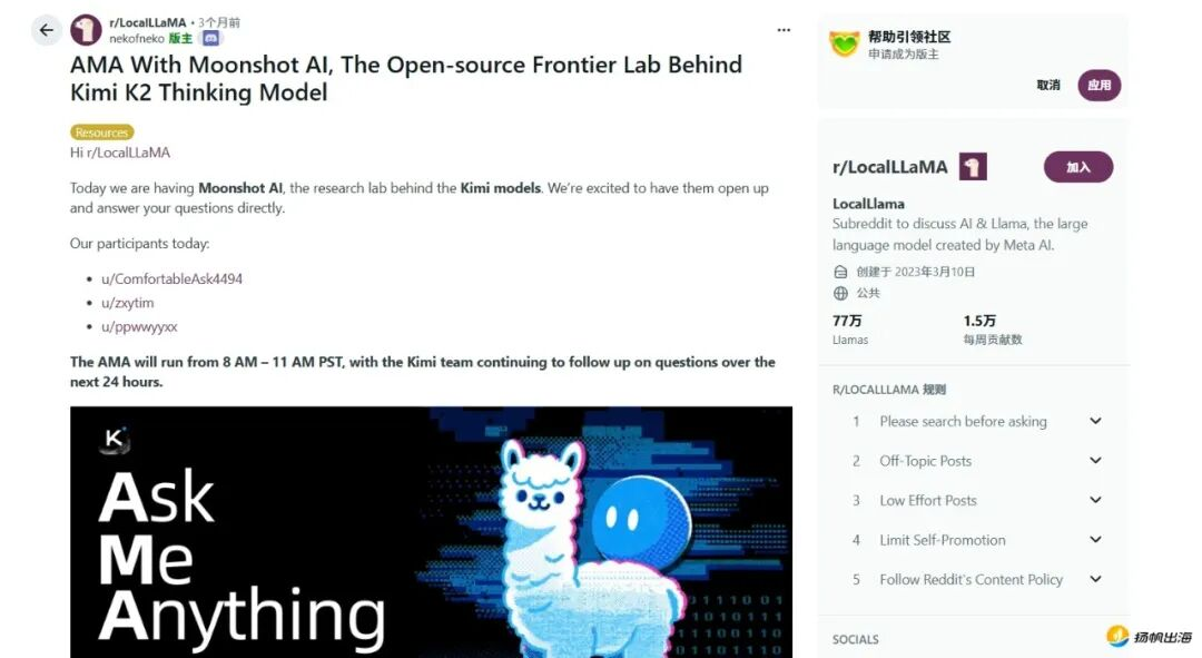 事实上,在曝光推广方面,Kimi在海外以“真诚分享”替代商业营销,重点聚焦海外技术社区与垂直圈层,通过核心工程师下场分享、传递技术价值,依托工程师IP与用户口碑实现自然扩散,尤其在Reddit的r/LocalLLaMA(AI从业者/爱好者)、r/MachineLearning、r/OpenAI等垂直板块,通过直接对话、技术答疑进一步扩大海外影响力。